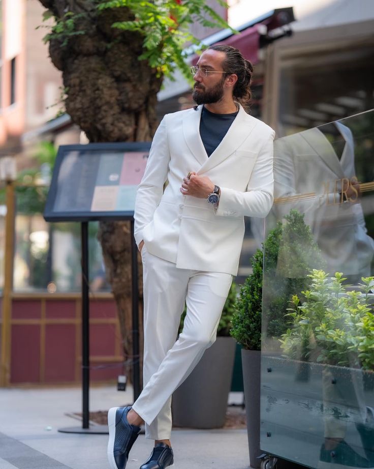 Men's Beige Striped Double Breasted Slim Fit Suit
