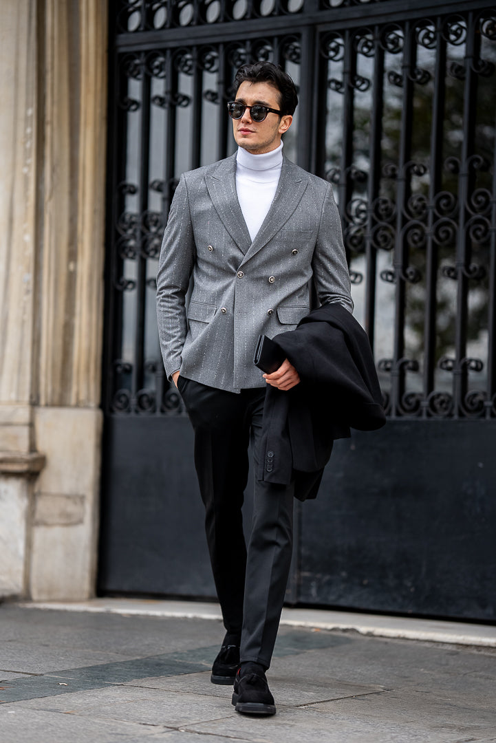 Upgrade your professional wardrobe with this Men’s Grey Striped Double-Breasted Blazer, combining classic design and modern tailoring.